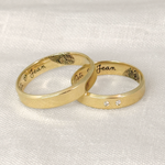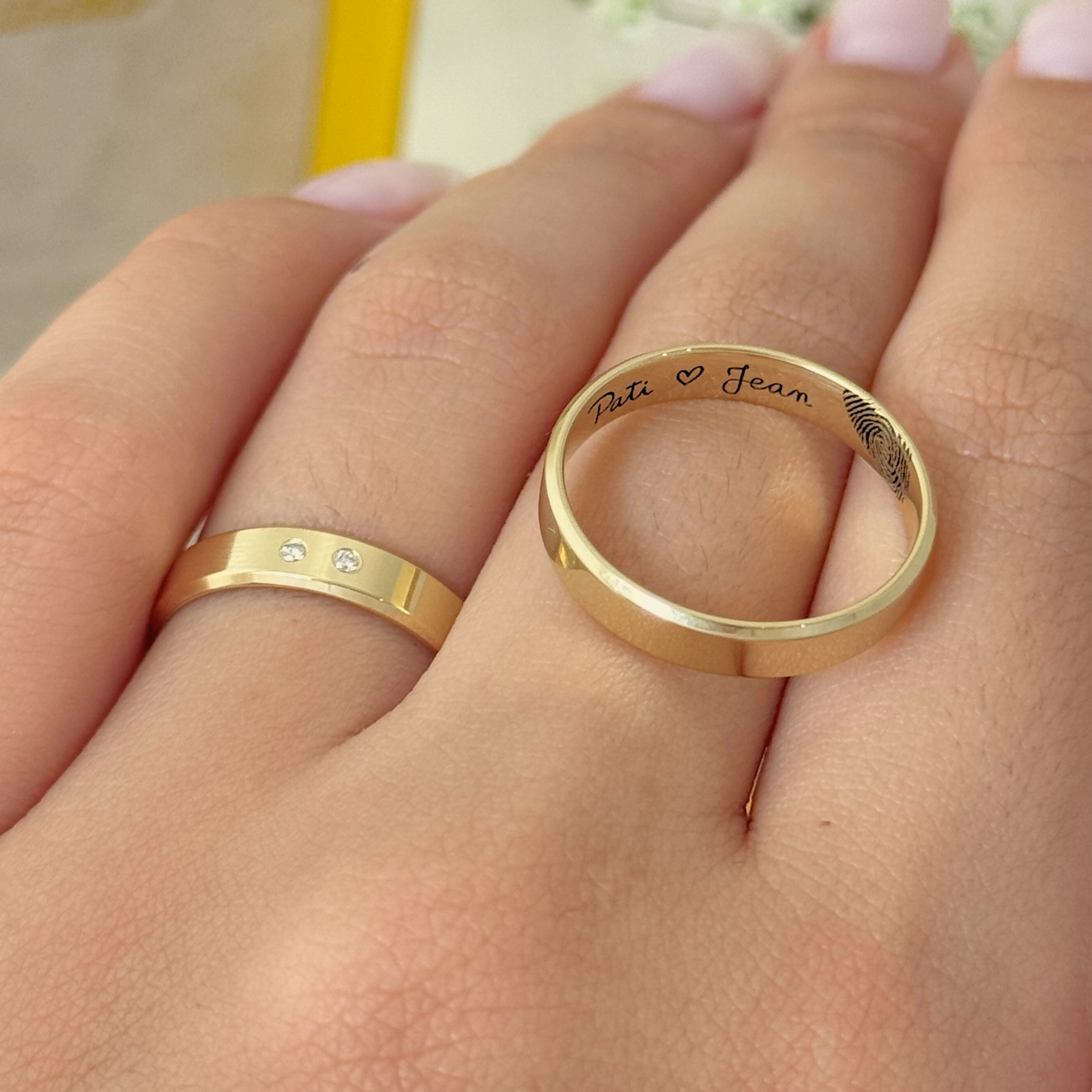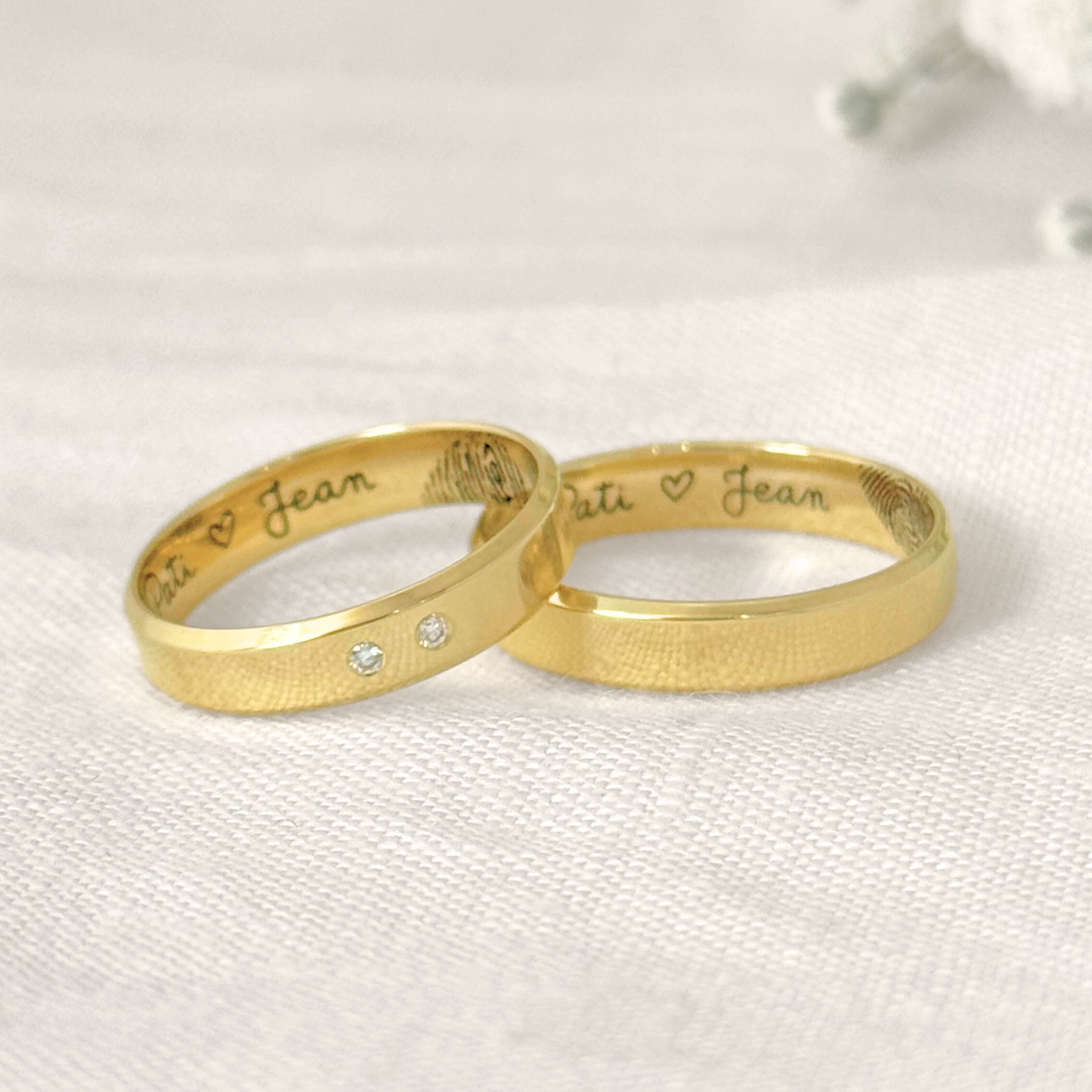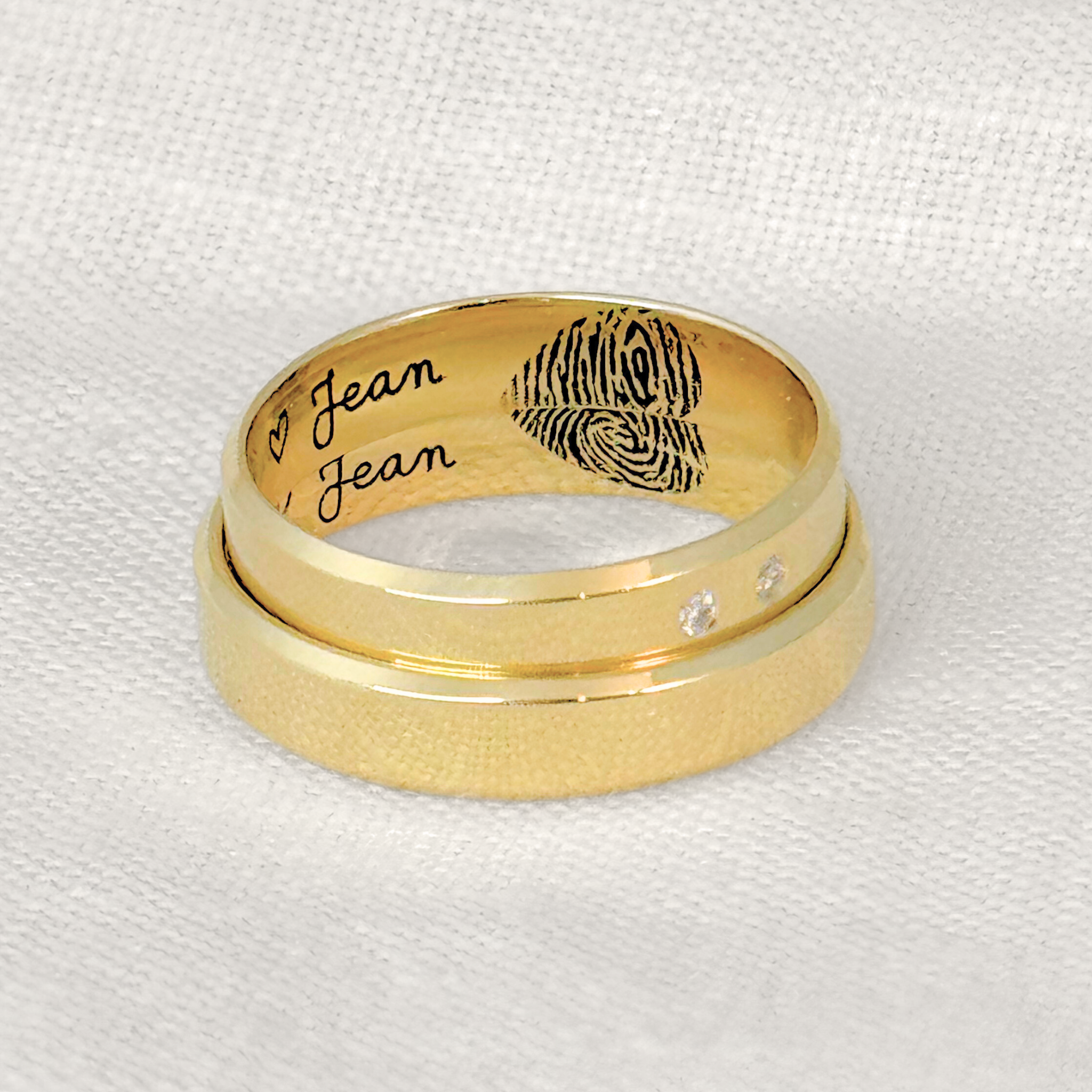 Par de Alianças Chanfrada - Ouro 18k - Uma aliança cravejada