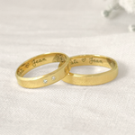 Elas são feitas em ouro 18k e seu design foi pensado para pessoas que buscam alianças minimalista, mas que transmitam todo o amor e conexão que há no arranjo matrimonial do casal, e as dois diamantes (pedras naturais) ou pedras sintéticas (zircônias) dão um toque muito delicado à uma das alianças. Escolha no botão acima, qual dessas variações você deseja.