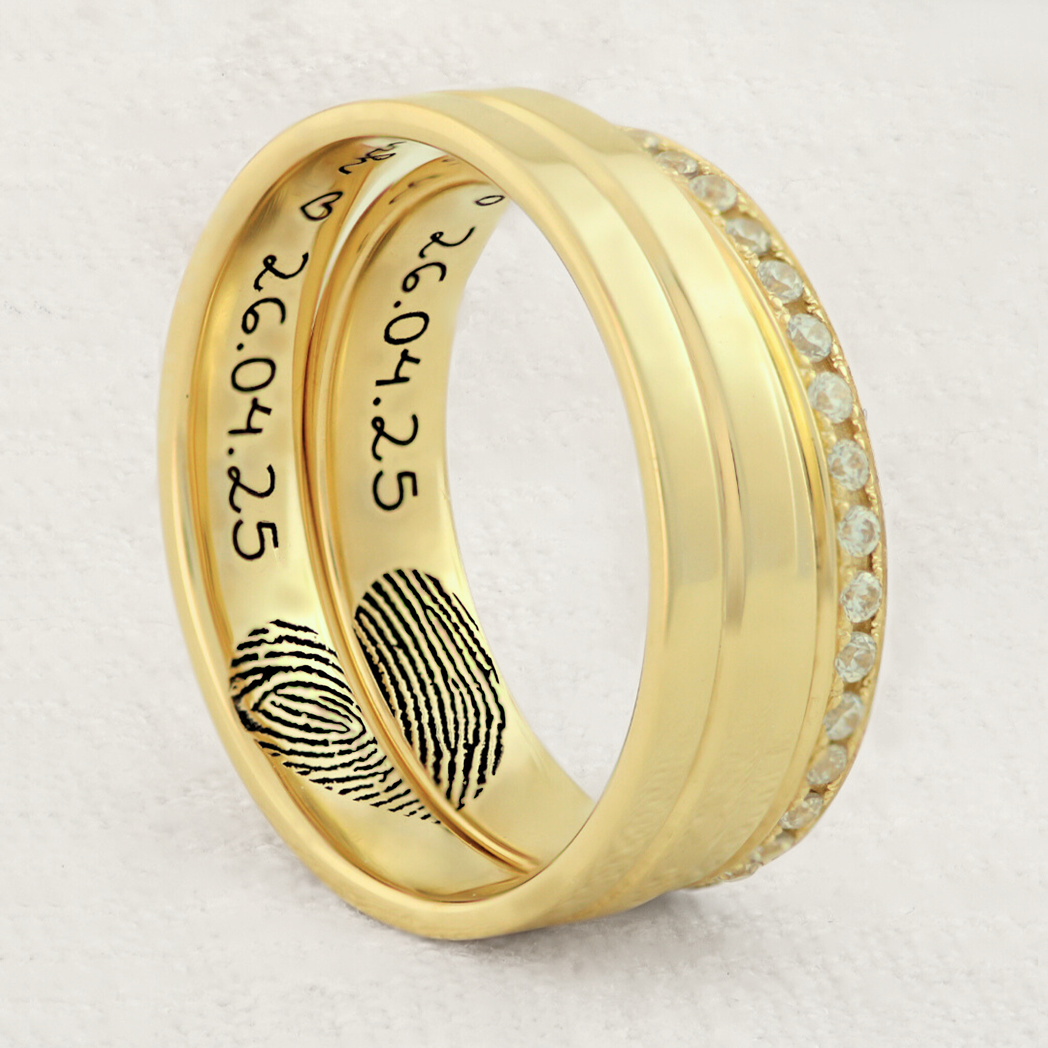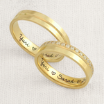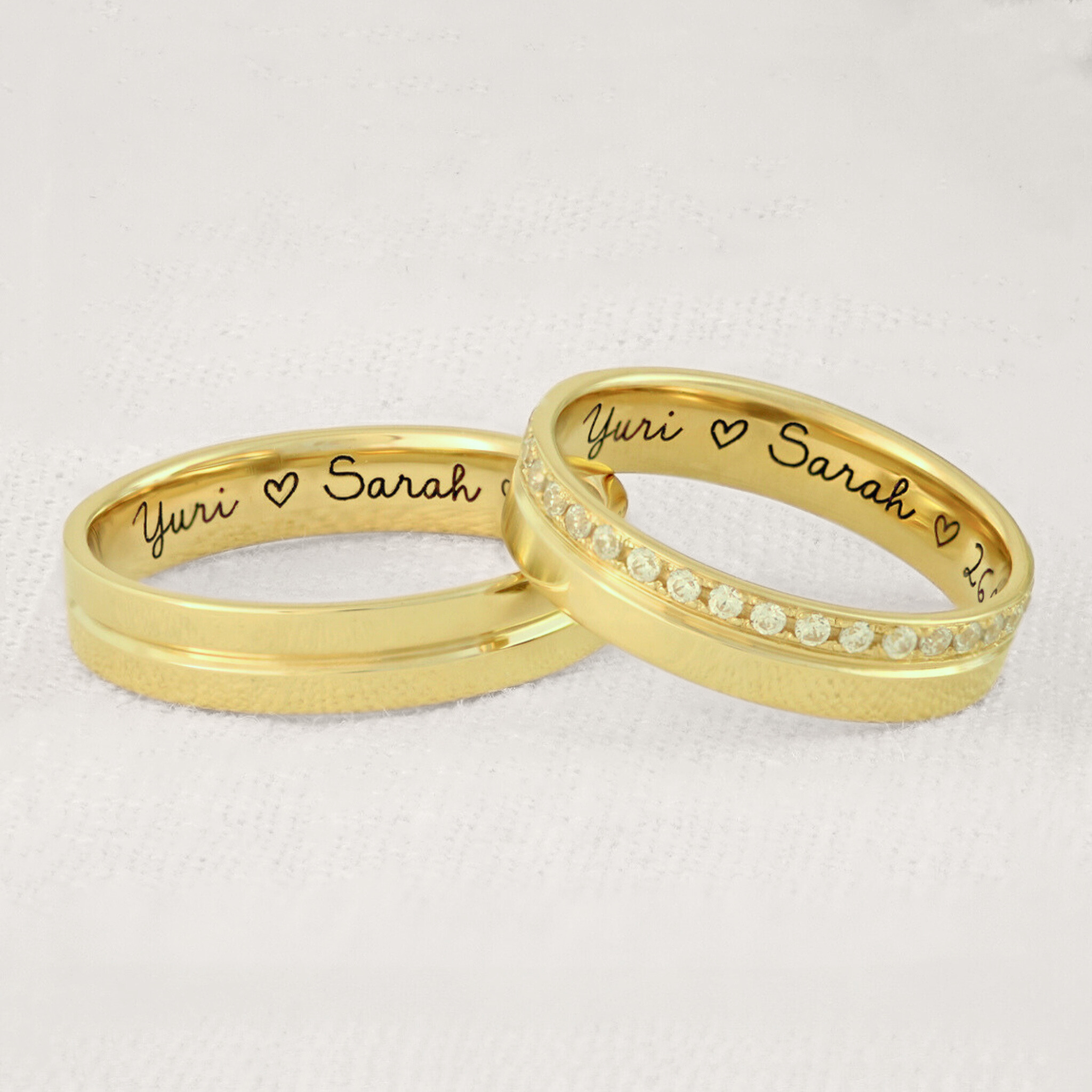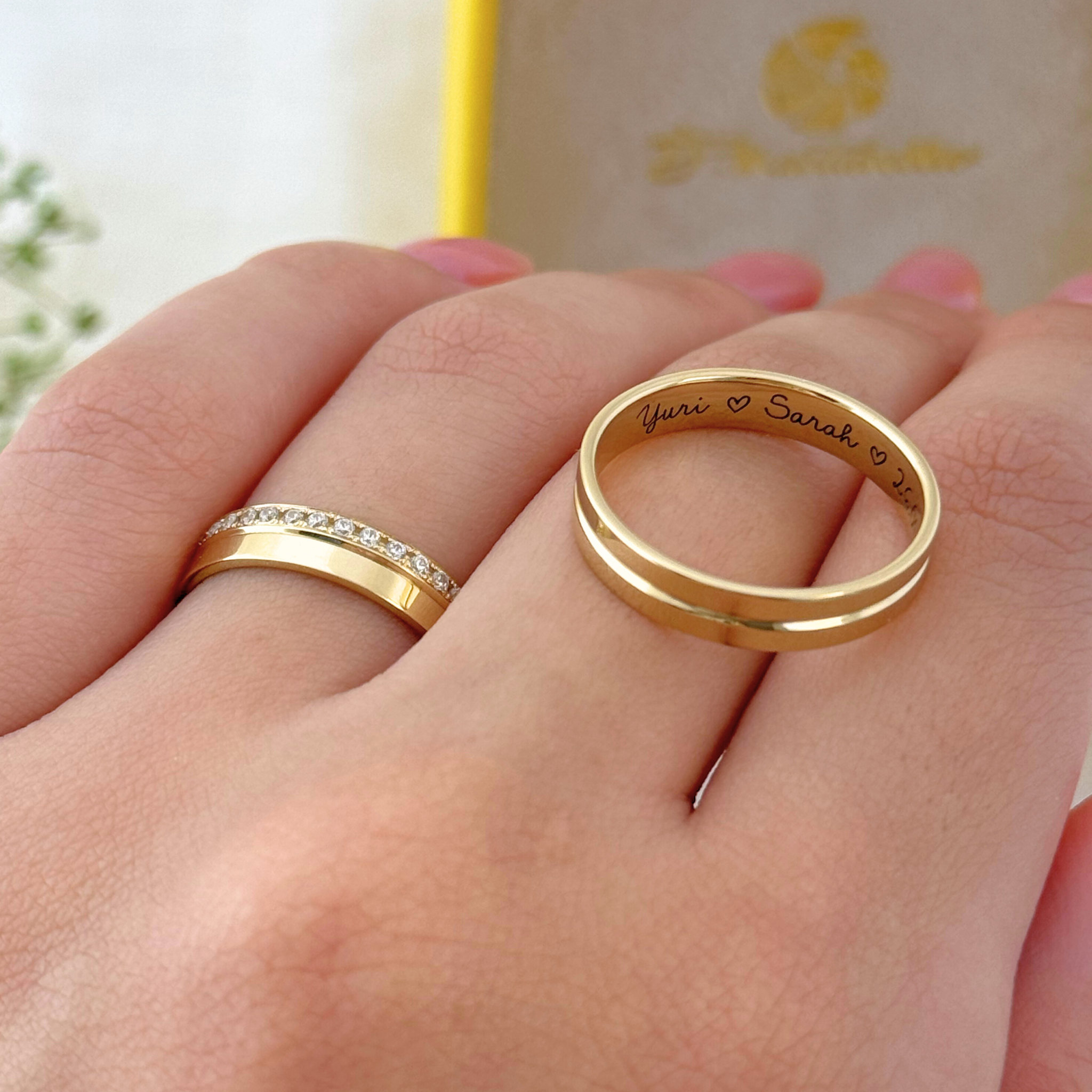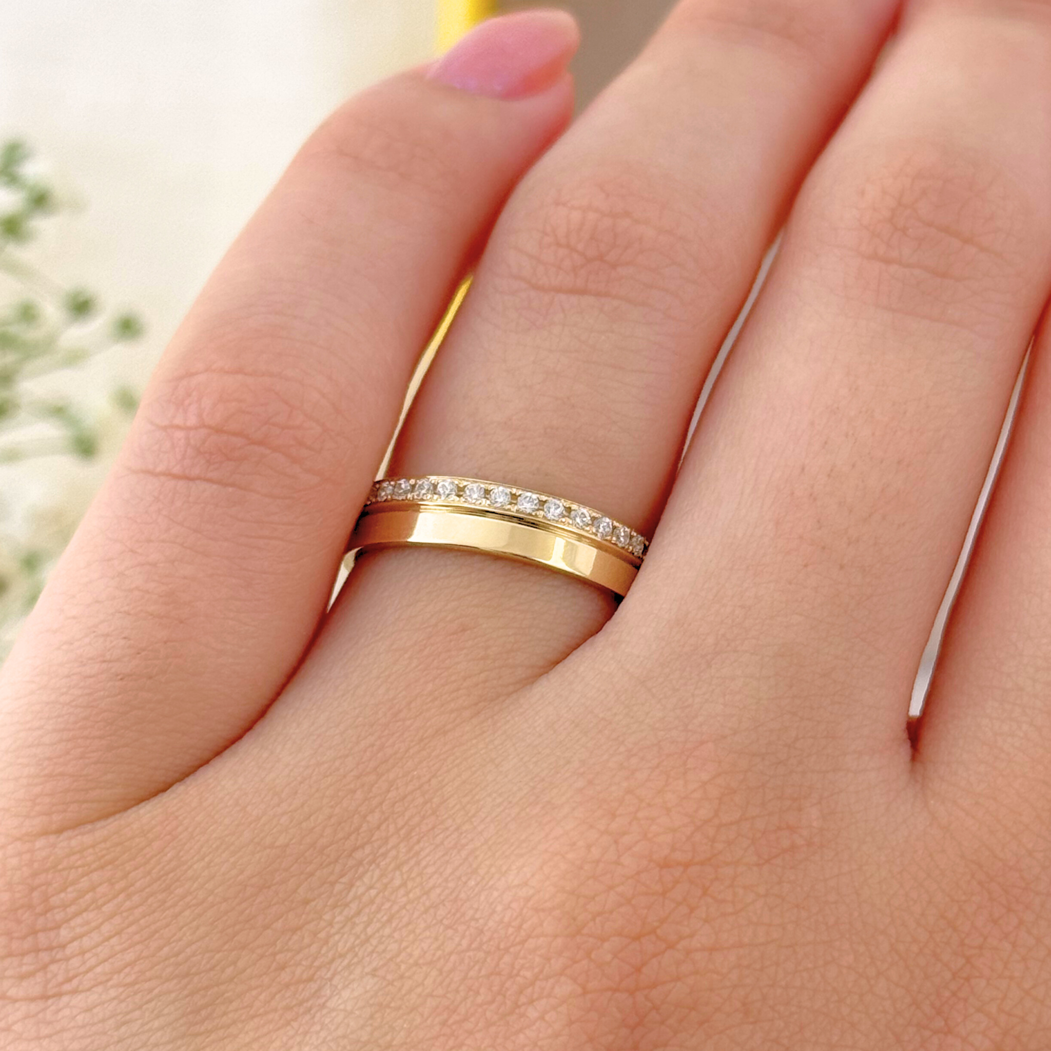 Par de Alianças com Friso Central - Ouro 18k - Uma aliança com volta inteira cravejada