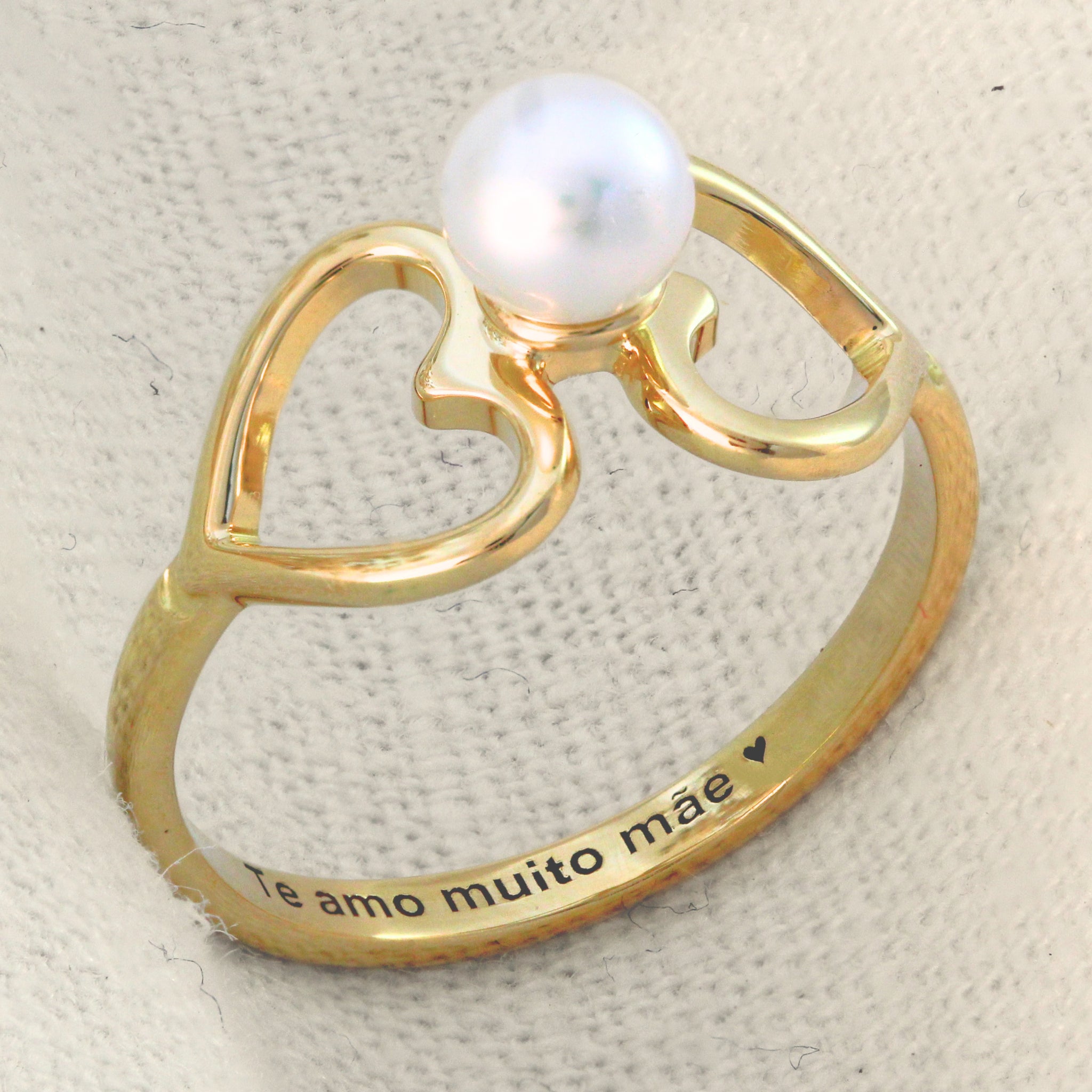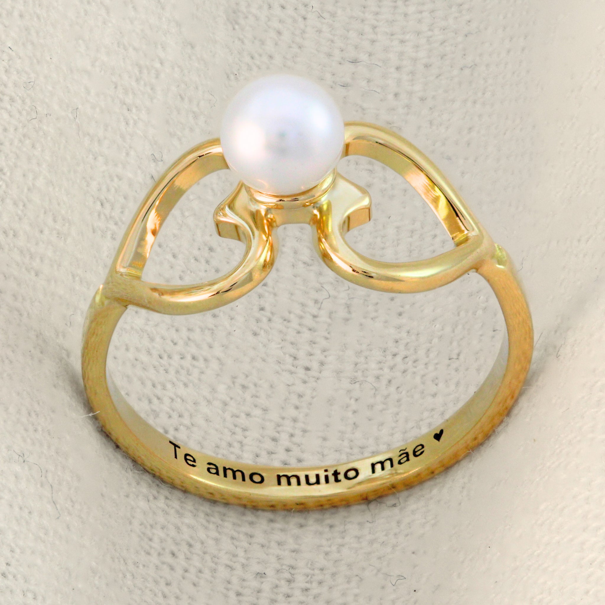 Com uma bela pérola no topo e dois corações ao seu redor, esse anel trás uma beleza e delicadeza única. E para carregar ainda mais significado, é possível fazer uma gravação personalizada na parte interna do anel.