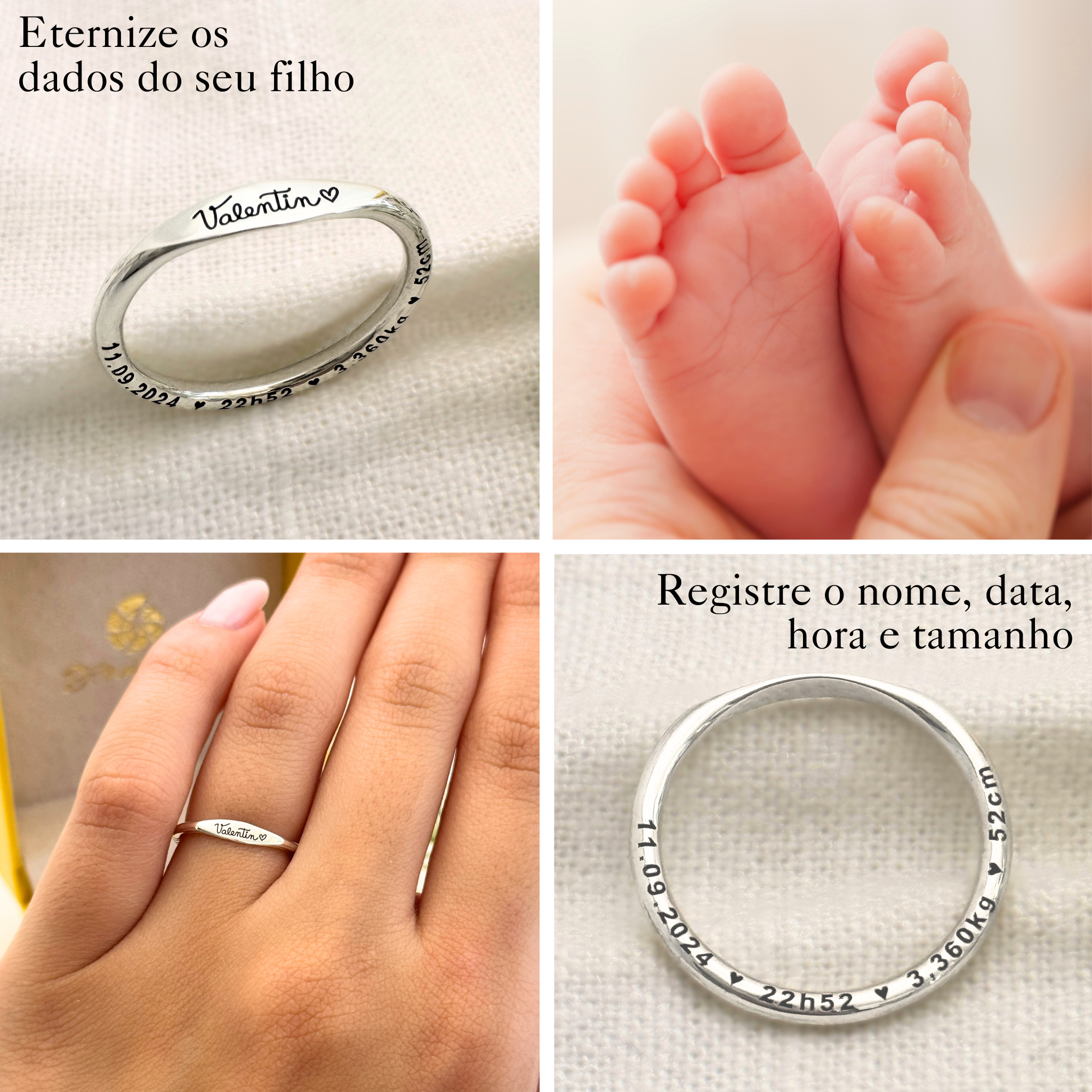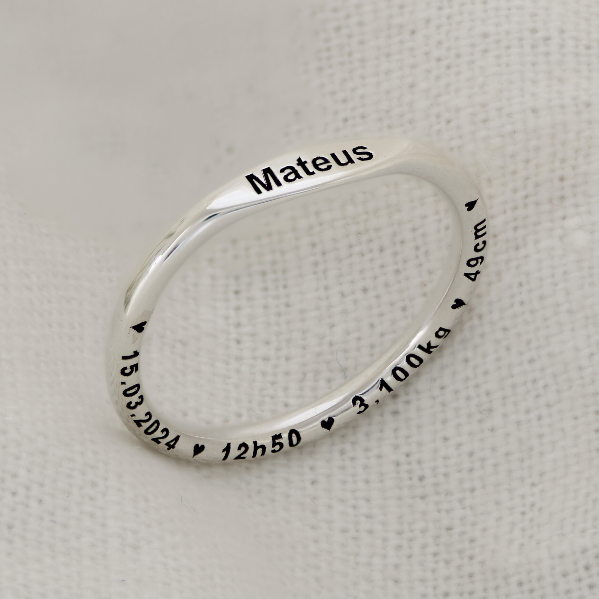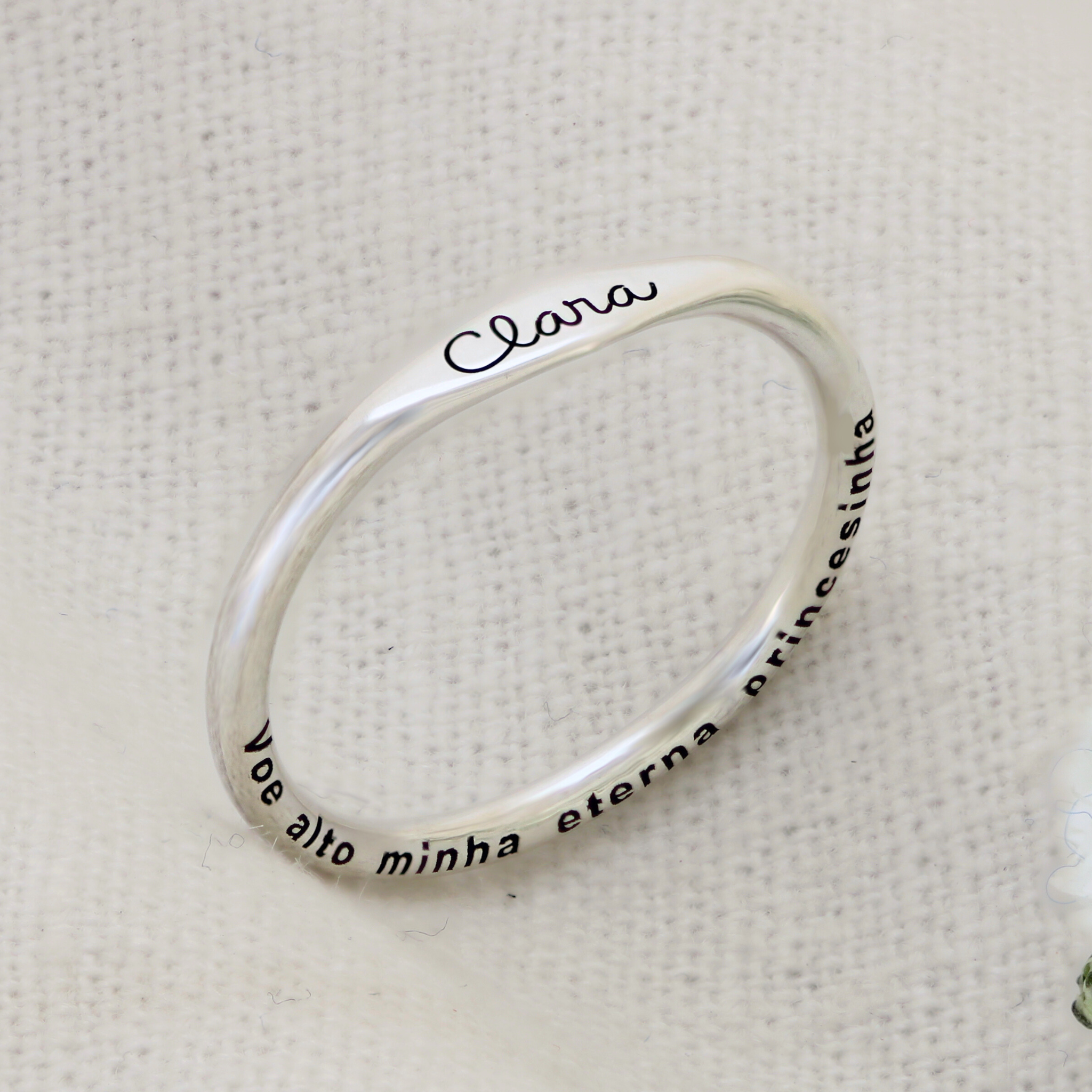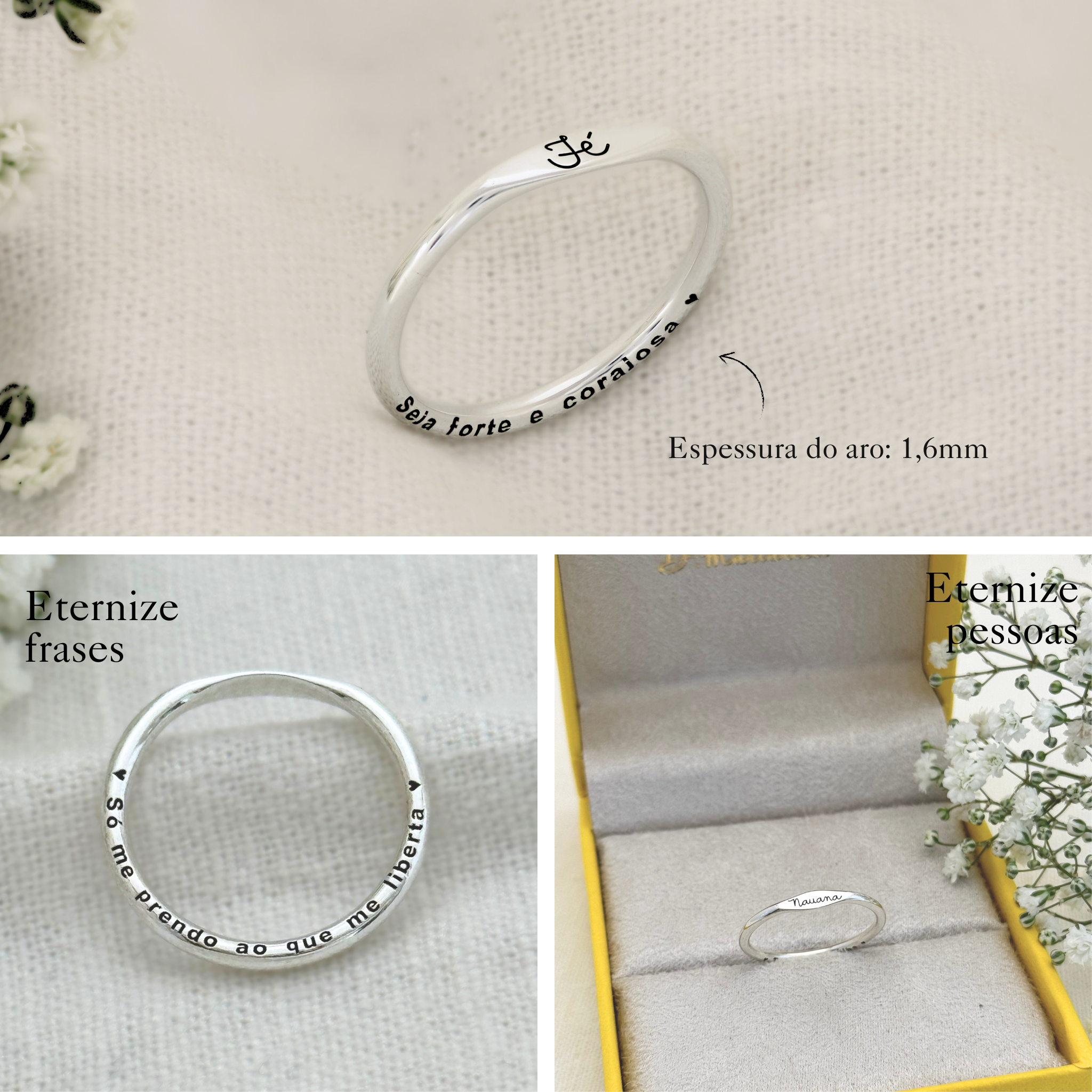 O Anel Personalizado 'Essência' é a escolha perfeita para eternizar momentos importantes e pessoas queridas. Feito em prata, esse anel pode ser gravado no aro e no seu topo, permitindo registrar datas especiais, nomes ou frases que marcaram sua vida. Seja um presente único para uma mãe, amiga ou você mesma, se trata de uma joia minimalista e cheia de sentimentos. Te dando um toque pessoal e exclusivo.