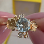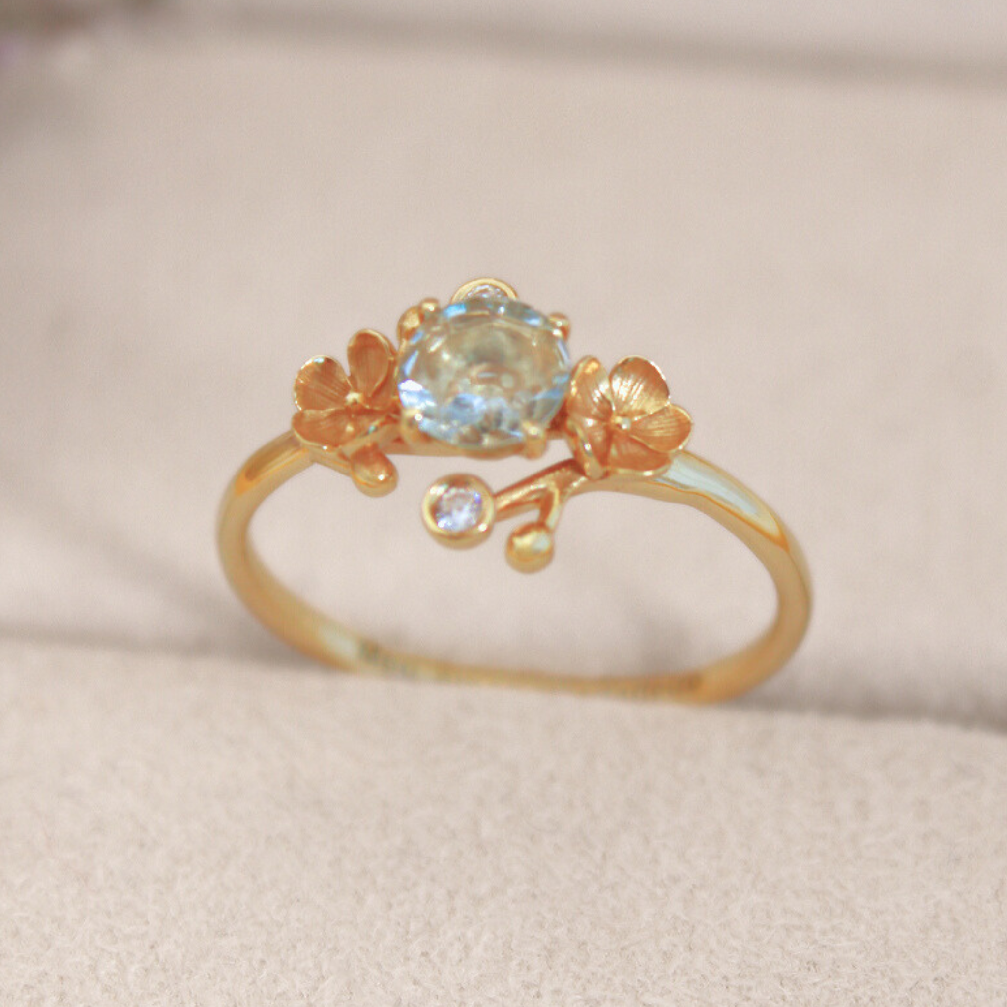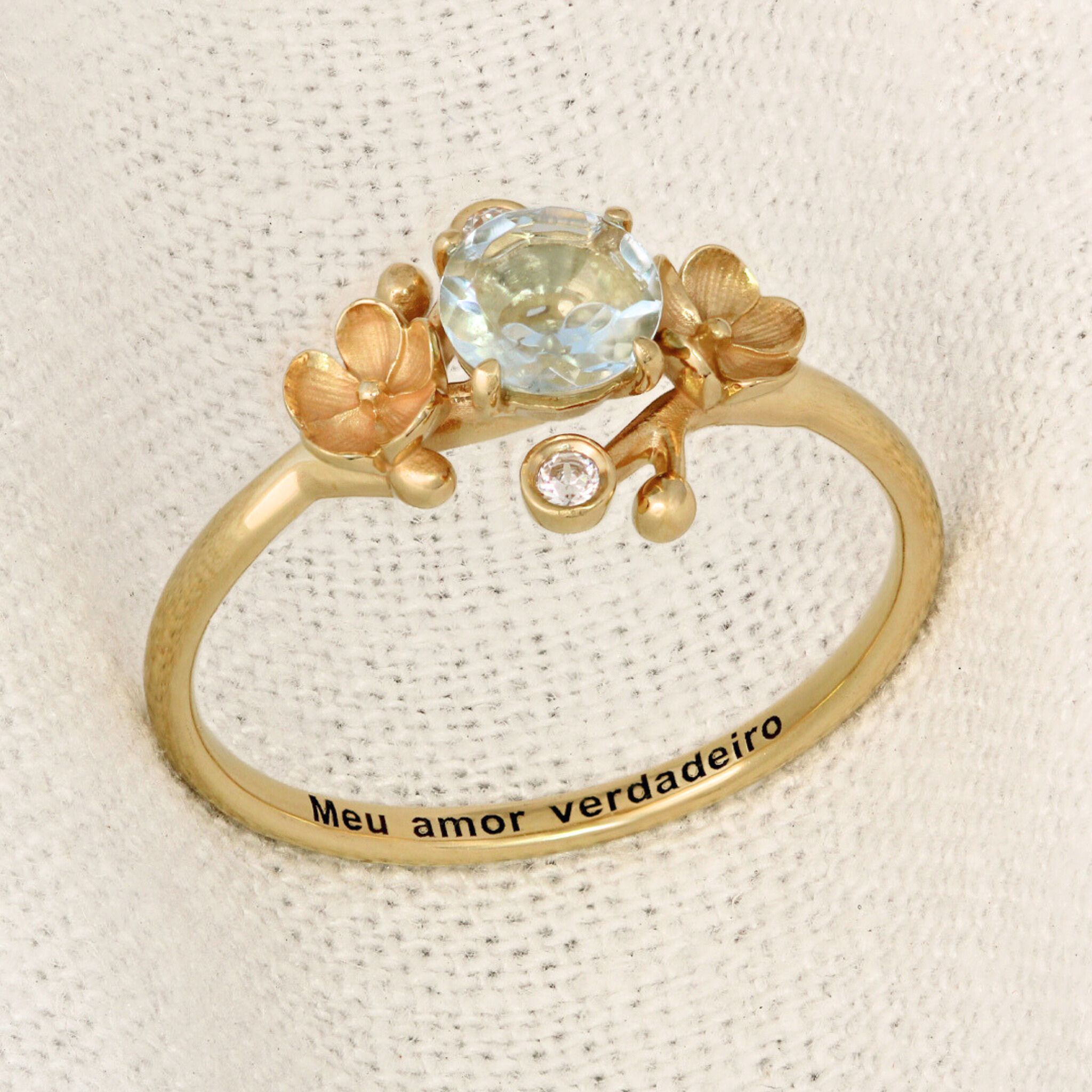 Nosso anel Macieira é confeccionado em ouro amarelo 18k e é inspirado na beleza e leveza da natureza em seus ramos e flores. Além disso, é adornado com pedras preciosas. Com uma água-marinha de 5 milímetros no centro e dois brilhantes de 1,5mm ao lado, ele trás a combinação perfeita das cores dos brilhantes e do azul claro da Água-Marinha e cria um visual belo e charmoso para quem aprecia joias com um toque único.