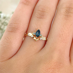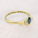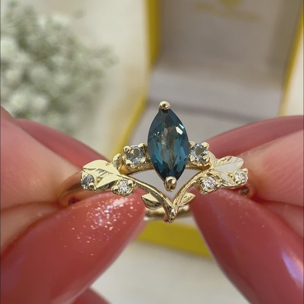 Este anel, confeccionado em ouro amarelo 18 quilates, traz a beleza da natureza para sua mão. Com ramos delicados, ele é adornado com um topázio london de 6x3 milímetros, quatro águas marinhas delicadamente espalhadas e dois diamantes de 1,5 milímetros. A combinação dessas pedras cria um visual delicado e encantador, perfeito para quem aprecia joias com um toque de natureza.