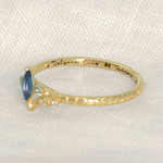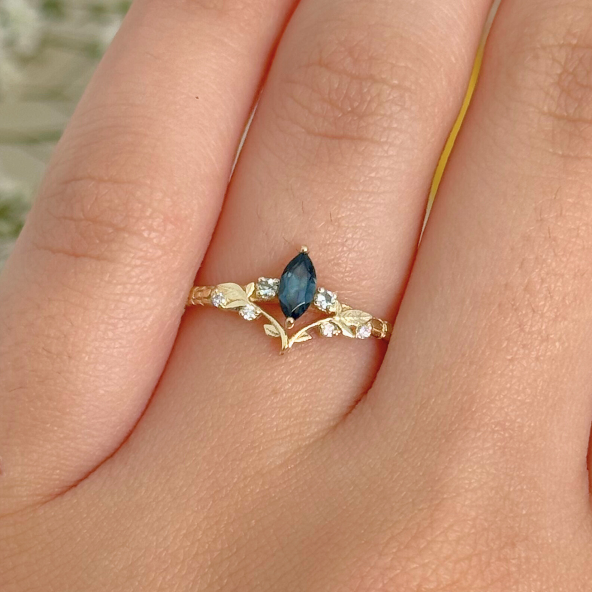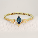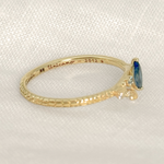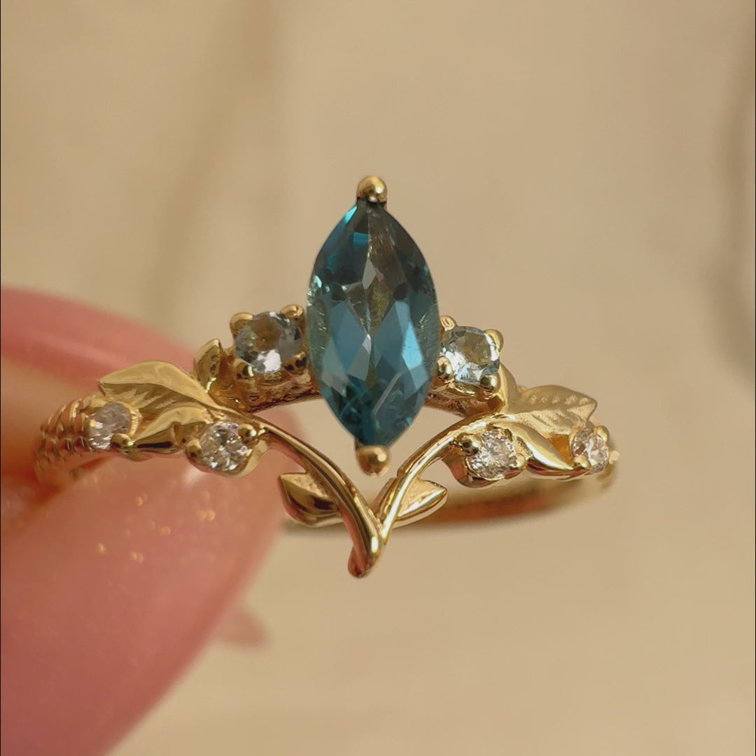 Este anel, confeccionado em ouro amarelo 18 quilates, traz a beleza da natureza para sua mão. Com ramos delicados e formas orgânicas inspiradas nas florestas nórdicas, ele é adornado com um topázio london de 6x3 milímetros, quatro águas marinhas delicadamente espalhadas e dois diamantes de 1,5 milímetros. A combinação dessas pedras cria um visual delicado e encantador, perfeito para quem aprecia joias com um toque de natureza.