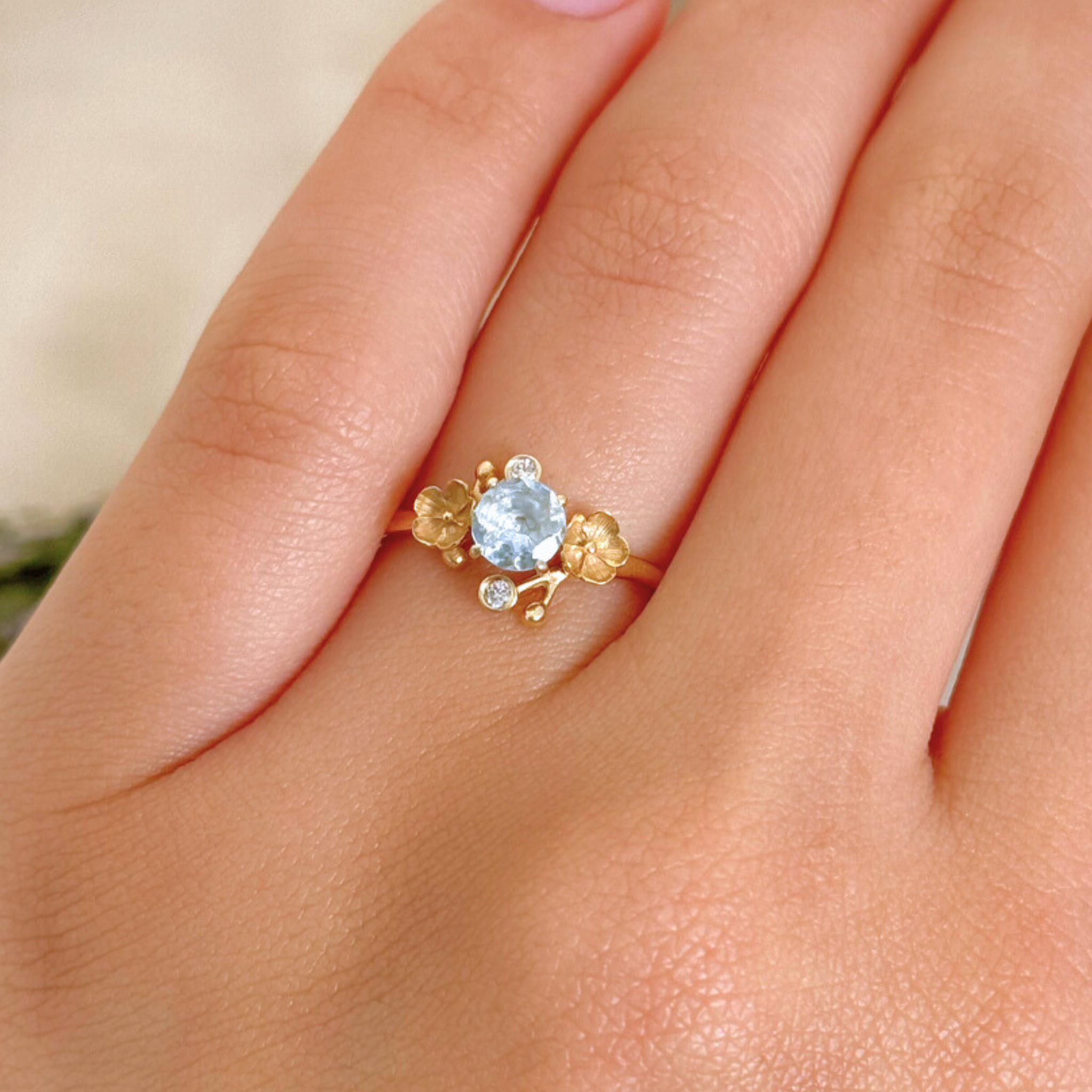 Nosso anel Macieira é confeccionado em ouro amarelo 18k e é inspirado na beleza e leveza da natureza em seus ramos e flores. Além disso, é adornado com pedras preciosas. Com uma água-marinha de 5 milímetros no centro e dois brilhantes de 1,5mm ao lado, ele trás a combinação perfeita das cores dos brilhantes e do azul claro da Água-Marinha e cria um visual belo e charmoso para quem aprecia joias com um toque único.