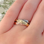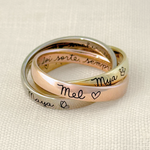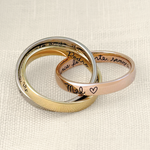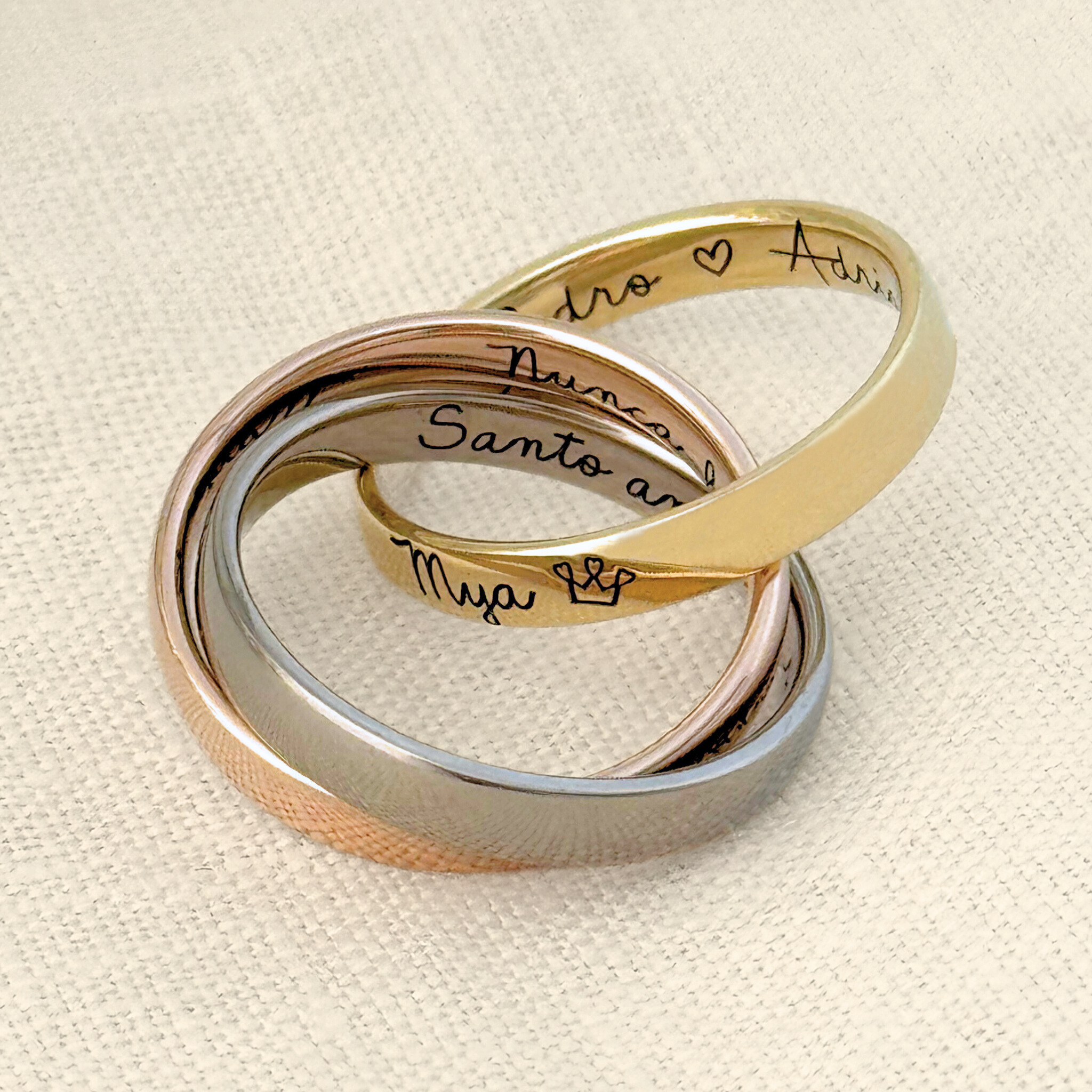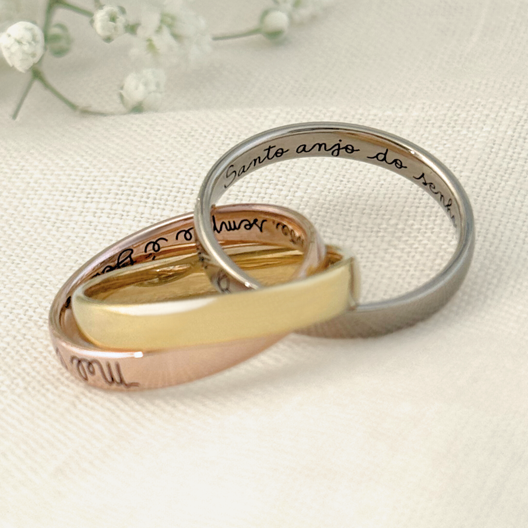 Esse modelo é feito com os três tipos de ouro 18k, e com a junção dos aros, transmite a essência da união no casamento, que é a formação de uma nova família. Nelas é possível gravar os nomes mais importantes que há na vida de alguém, além de poder colocar símbolos e/ou frases que os represente.